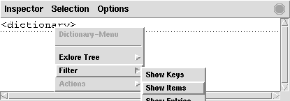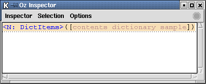 The Inspector defines default mappings for many data types, to perform commonly-used operations such as inspecting the state of mutable data structures. Figure 3.3 demonstrates an example of this: By default, dictionaries are displayed as the unspecific tag <dictionary>. The default mapping “Show Items” for dictionaries replaces the dictionary node by a snapshot of its contents (specifically, as the result of the Dictionary.items procedure).