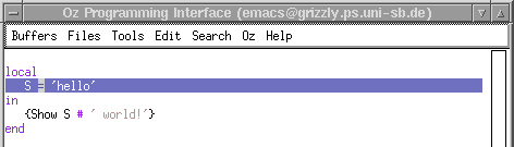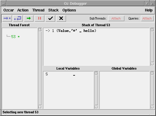 The thread has been stopped immediately after its creation, so the Stack View displays a single frame, containing the first application in the program, S = 'hello', which, expressed in Oz core syntax, corresponds to {Value.'=' _ hello}. Instead of the variable name the variable’s value is displayed in the Stack View (where the underscore stands for a logic variable). If we explicitly needed to check what the value of S is, we could look it up in the Local Variables View.